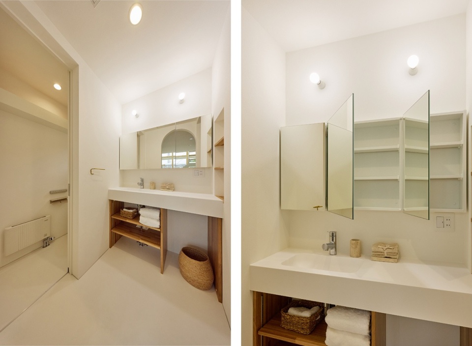 こちらの洗面化粧台は「メイクの際に顔に影がかからないようにしたい」「棚の内側にもコンセントがほしい」といった要望に応え、光の当たり方まで計算されています。