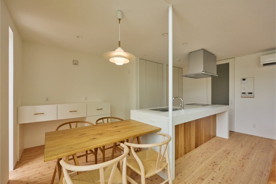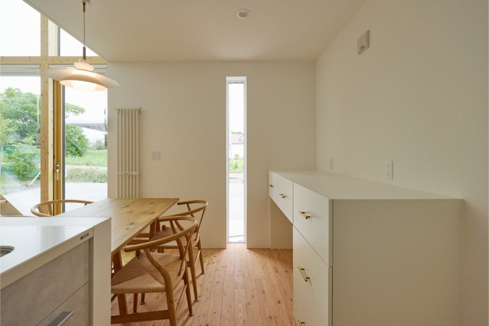 ダイニングの背面には、引き出しタイプのキッチン収納を部屋全体の雰囲気に合わせて造作しています。