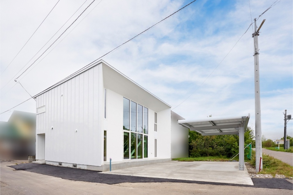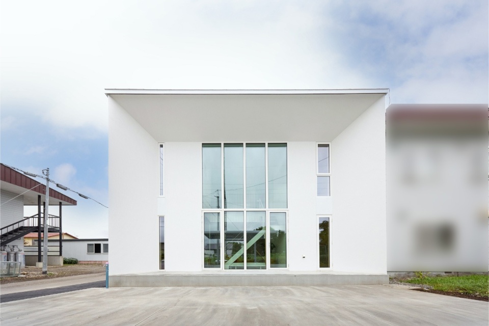 外観は白い塗り壁とシンメトリーに並んだ窓が印象的です。「30年先を見据え、時代を感じさせないオーソドックスなデザインを意識しています」と設計を担当した作田雅俊さん。