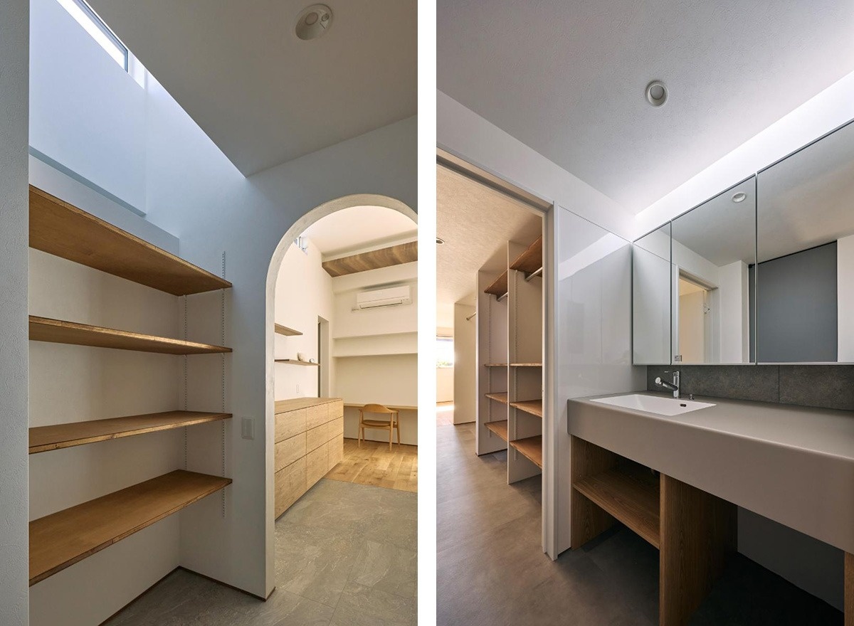 パントリー(写真左)の上部に高窓がありました。窓の向かいにある壁がレフ板のような役割を果たし、パントリーだけでなく、壁を隔てた裏側に位置する洗面室(写真右)も明るく照らしています。暗くなりがちな家の中心部でも、照明に頼らず過ごせます。