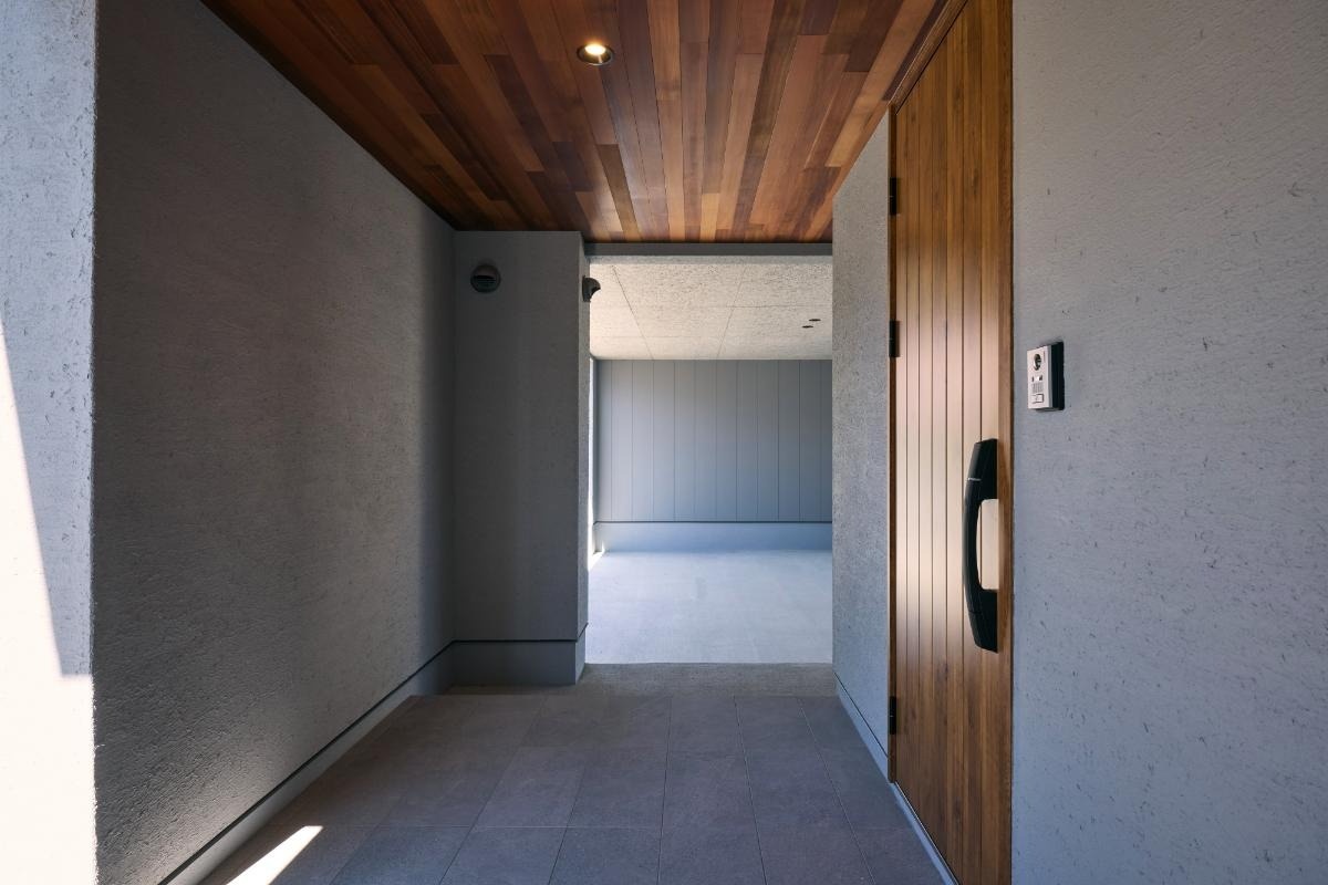 玄関ポーチの面積は10.47㎡と、ゆったりとした造り。ポーチ天井にはレッドシダーを使っています。
