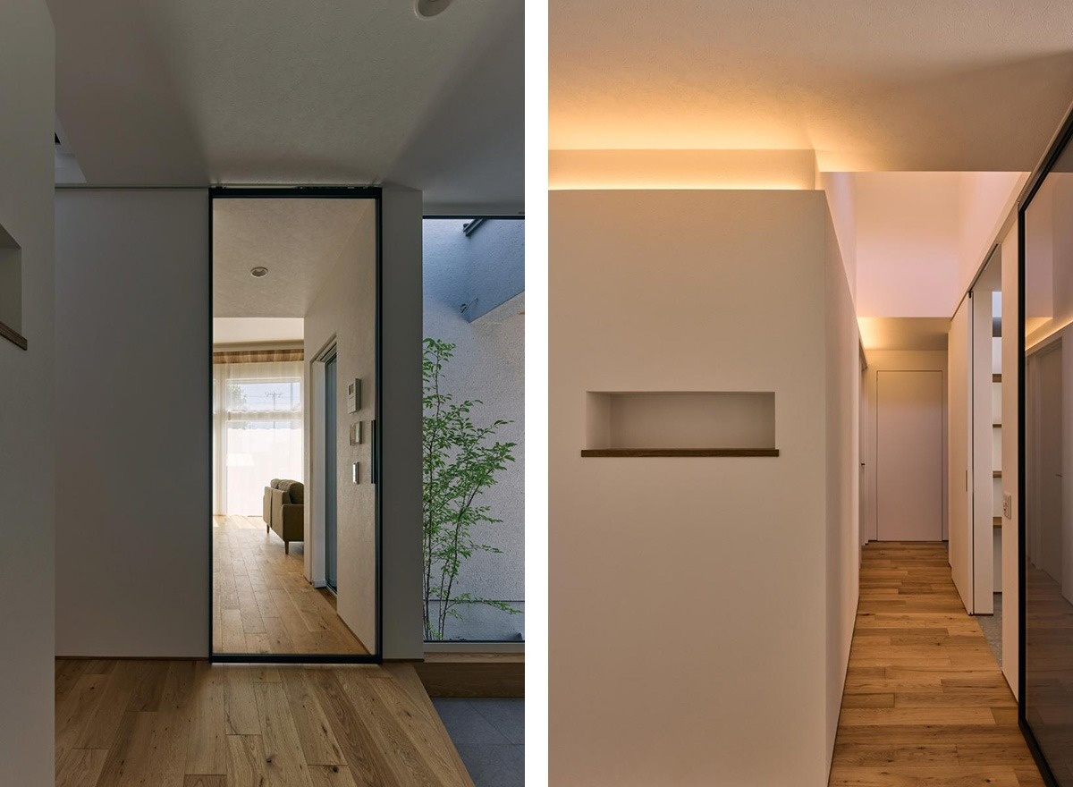 リビングドア(写真左)はLIXIL社の「ラフィス」。壁の厚みの差を使った間接照明(写真右)は吉田社長によるデザインで、昼と夜で異なる魅力を放ちます。