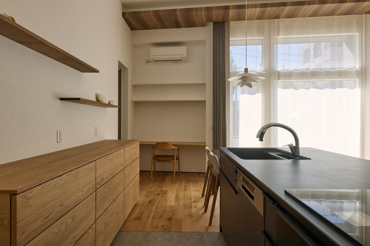 デスクスペースで学習するお子さんの様子を見守りながら調理できるキッチン。