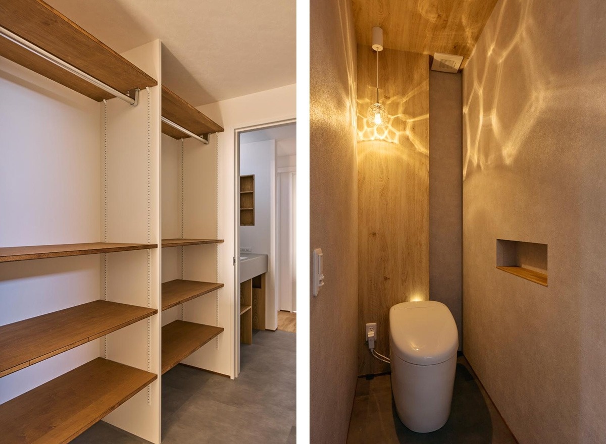 写真右/トイレは背面壁の裏に収納を備えています。扉なしのシンプルな形でも中身が目に触れない、スマートなデザイン。ペンダントライトの陰影も素敵です。