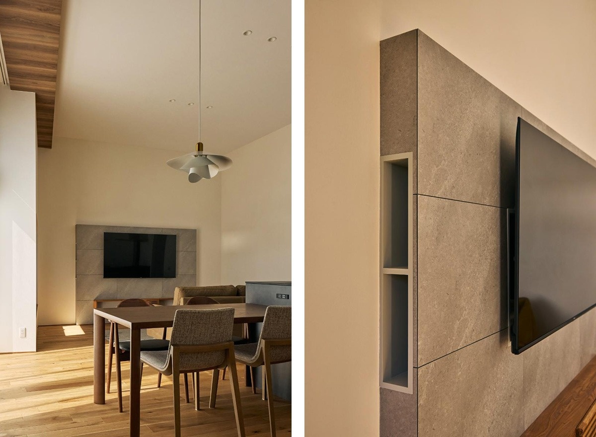 LDKのテレビボードには、側面にゲームなどを入れられる収納が。配線もすっきりと収まる構造です。素材はフロアタイルで、コストを抑えながらも美しい仕上がりに。