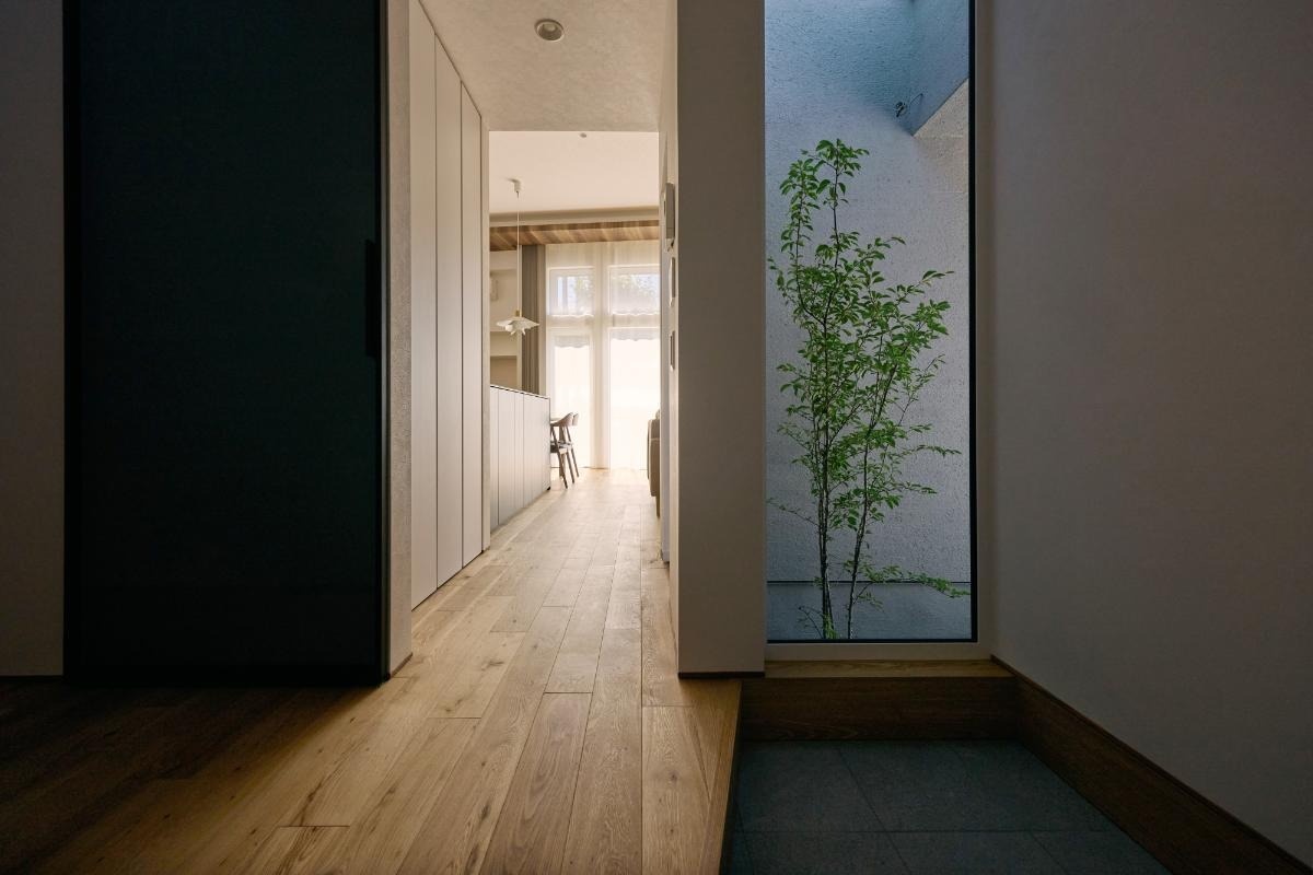 今回の住宅には「気持ちのよい自然光や四季の移ろいを感じられるように」という吉田社長の発案で、玄関脇に坪庭をつくりました。夜間にはアオハダの木がライトアップされ美しい陰影が楽しめる、オーナーさんお気に入りのポイントです。
