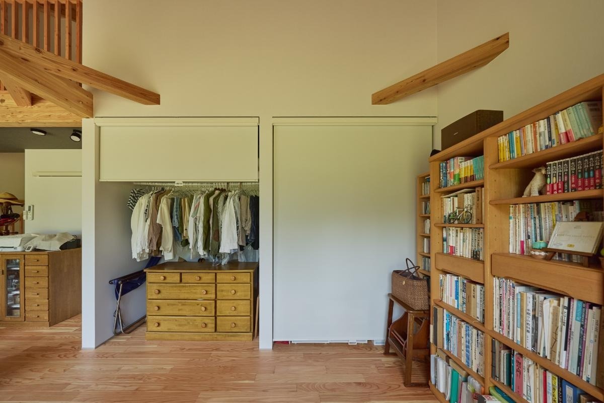 リビングの一部には、いずれ寝室にもできるようクローゼットを設けました。浴室からの動線もスムーズで、一階だけで生活が完結できるようになっています。
