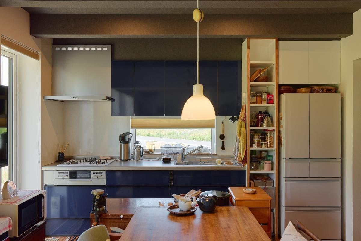 キッチンの面材には深いブルーを選びました。「シンプルな室内だからこそ、アクセントとして大胆な色を選べた」とEさん。お気に入りの空間となりました。
