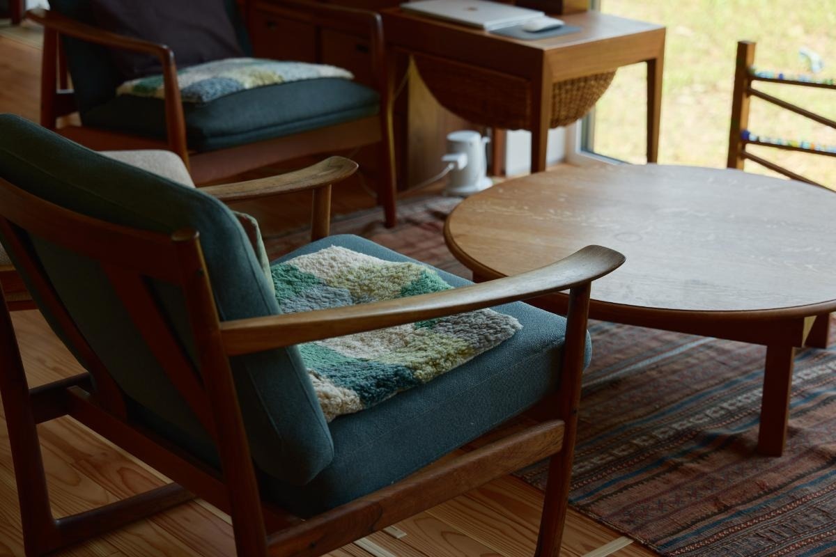 こちらのビンテージの椅子もデンマークのもの。テーブルはウイスキーの樽でつくられたものです。