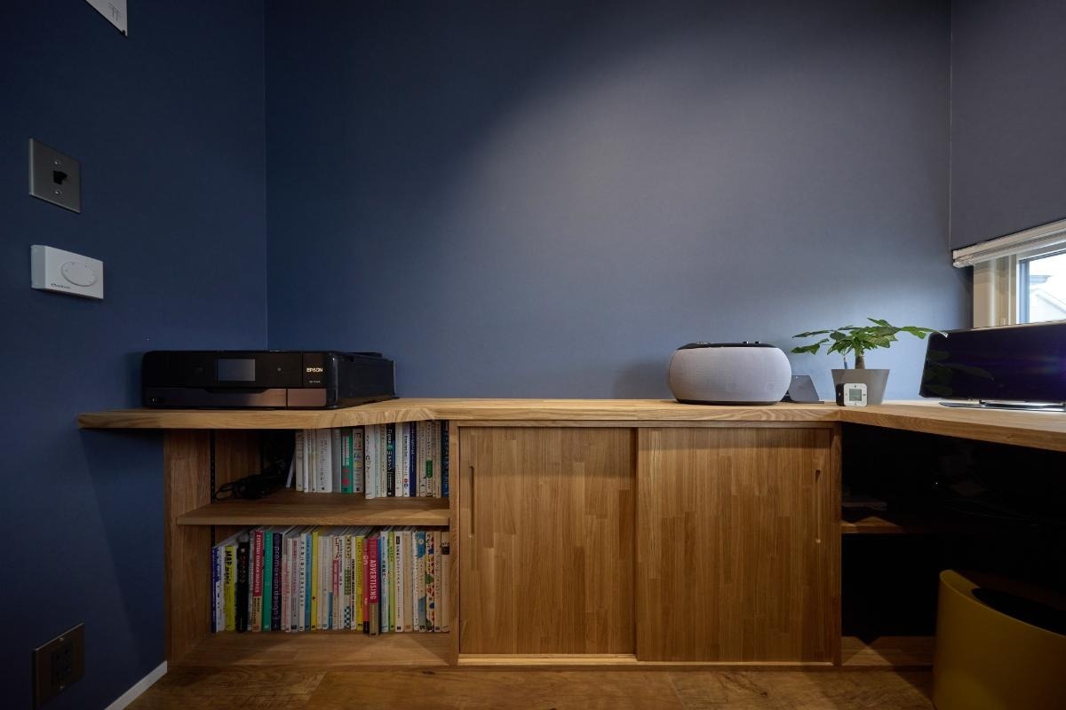 新居を建てるうえで最もこだわったというワークスペースは、Kさん自身の手で作成した図面を基につくられました。寸法を細かく指定したデスクは作業がしやすく、配線が美しく収まるようにデザインされています。