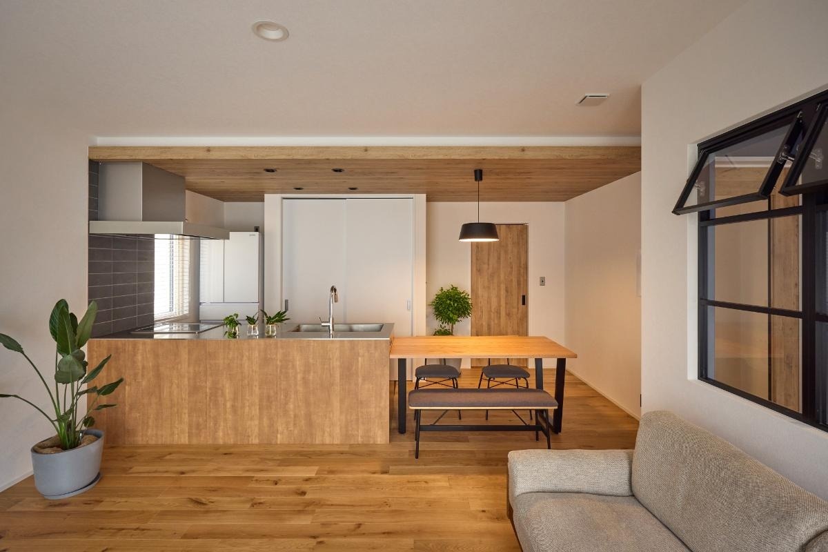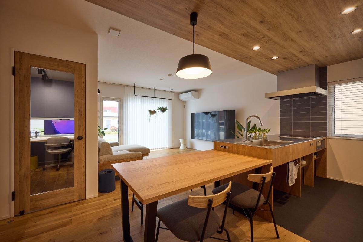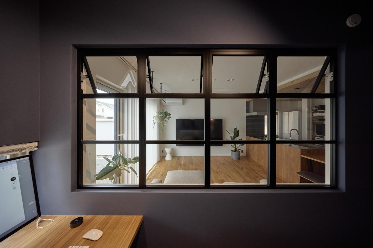 LDKには内窓つきのワークスペースが併設されています。床はオークの無垢材です。