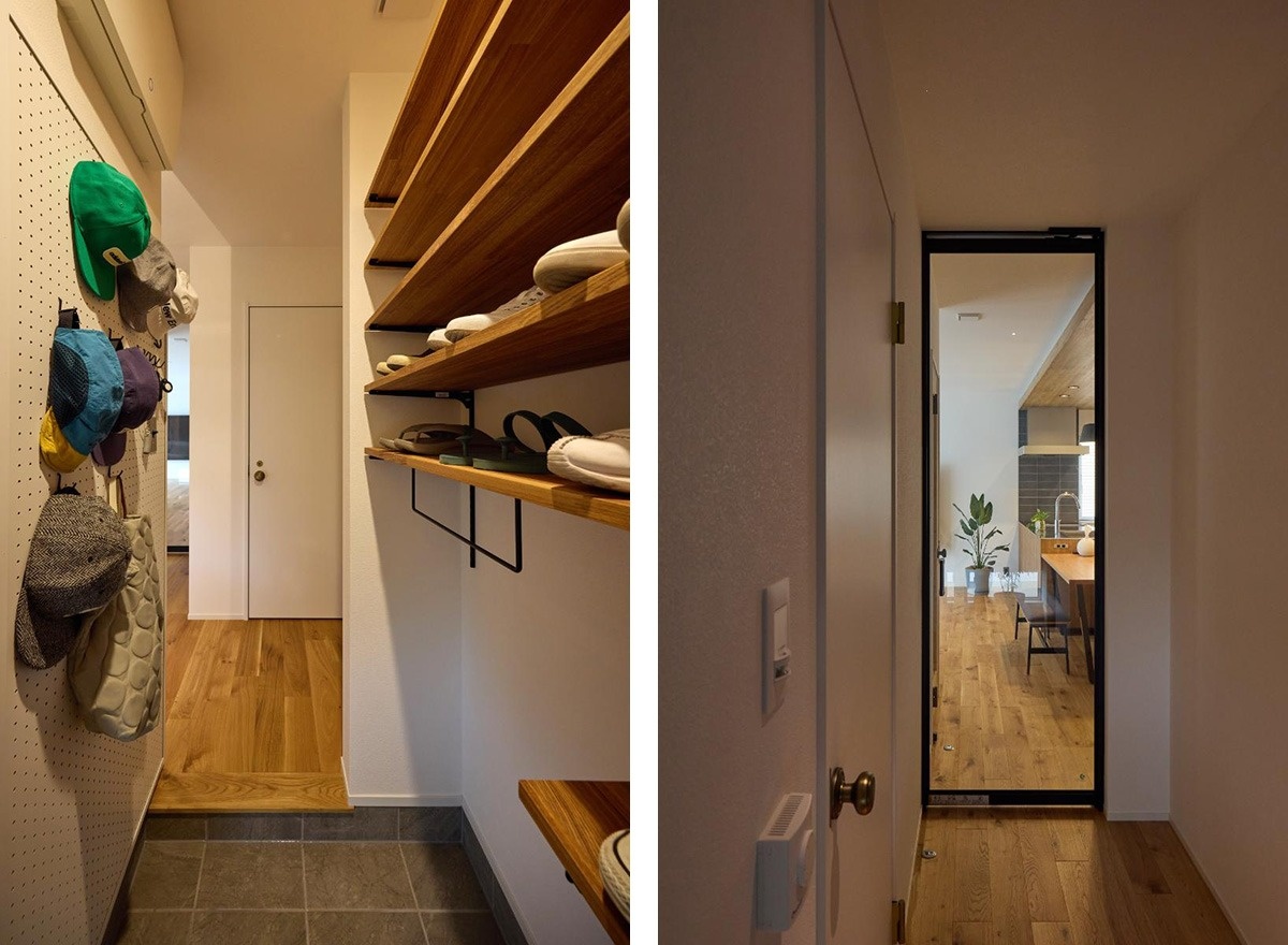 シューズクローク(写真左)の中には有孔ボードを張り、帽子やカギなどを掛けられるコーナーをつくりました。リビングドアはYKK AP社のガラス製ハイドア(写真右)。視界に奥行きが感じられます。