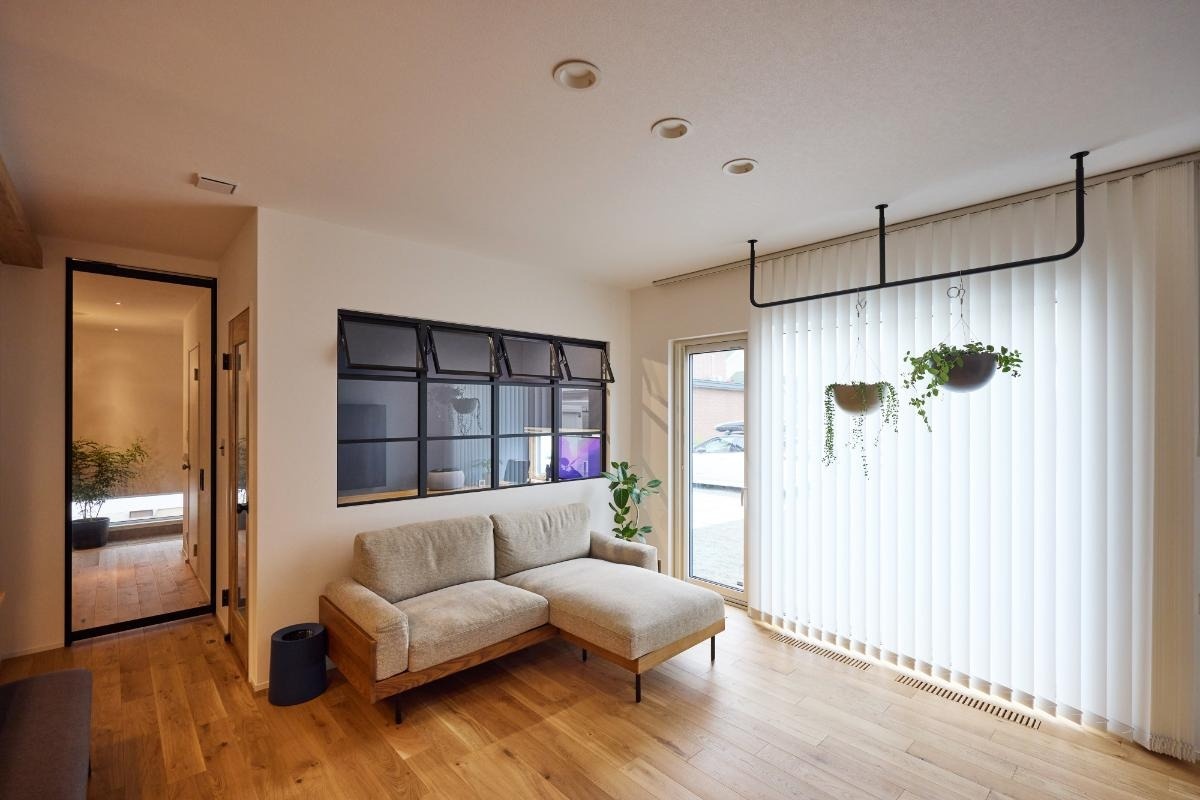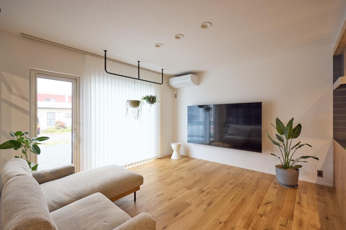Kさん カラーは白を基調にしました。色を絞ったことで後から加える家具やグリーンの色が映える部屋になったと思います。ハンギングバーは、窓際の光がつくる葉影の表情も気に入っています。