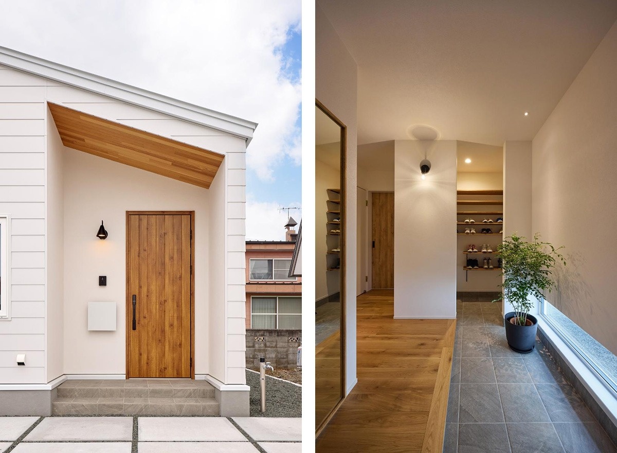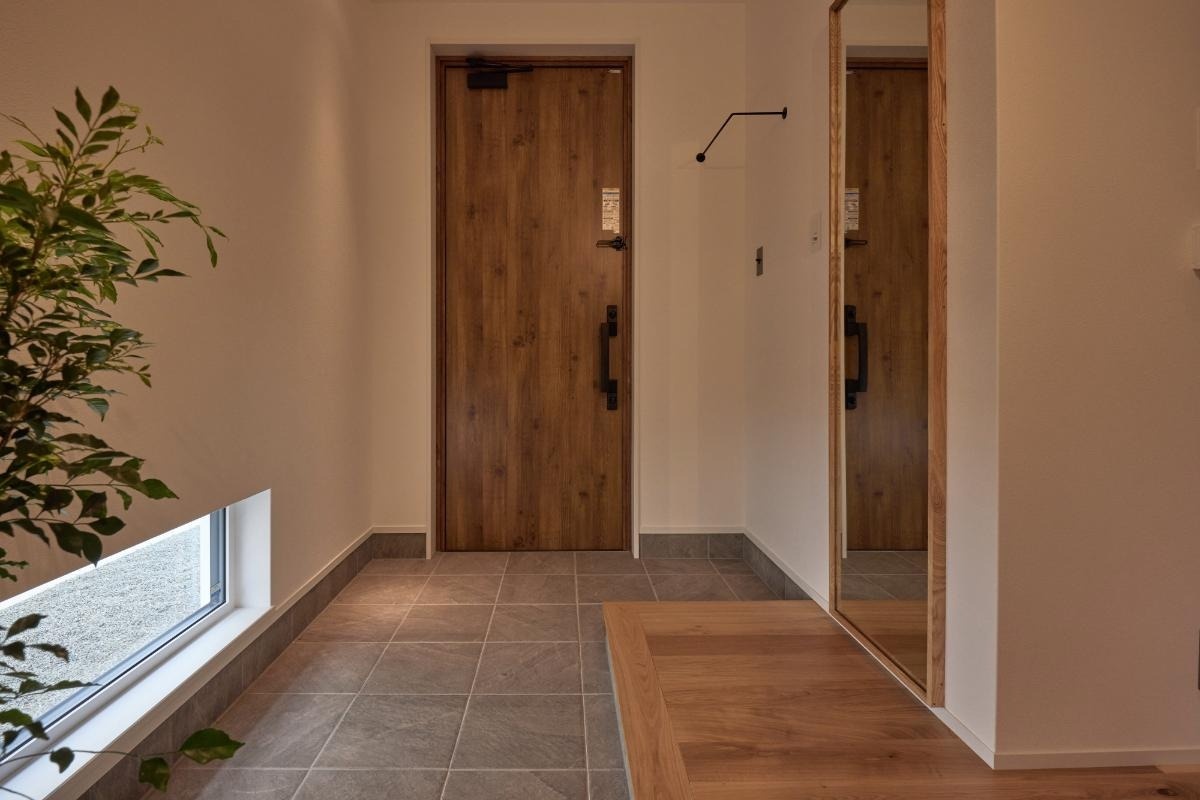 写真右/地窓から安定した光が差し込む玄関。造作の姿見には空間を広く見せる効果も。