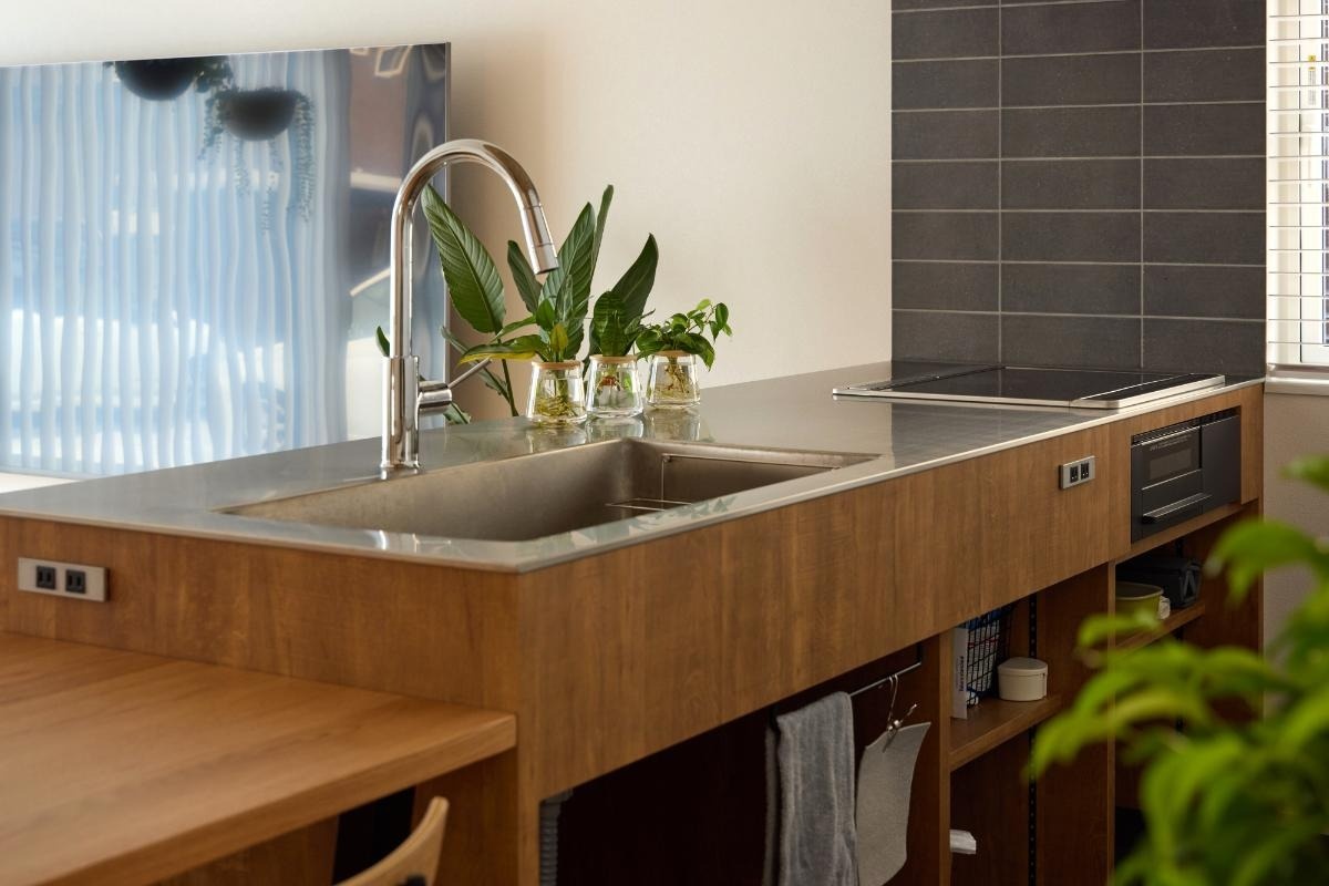 「見た目重視で」とオーダーしたという造作キッチンは、薄いステンレスのワークトップとメラミンの化粧板で洗練されたデザインです。