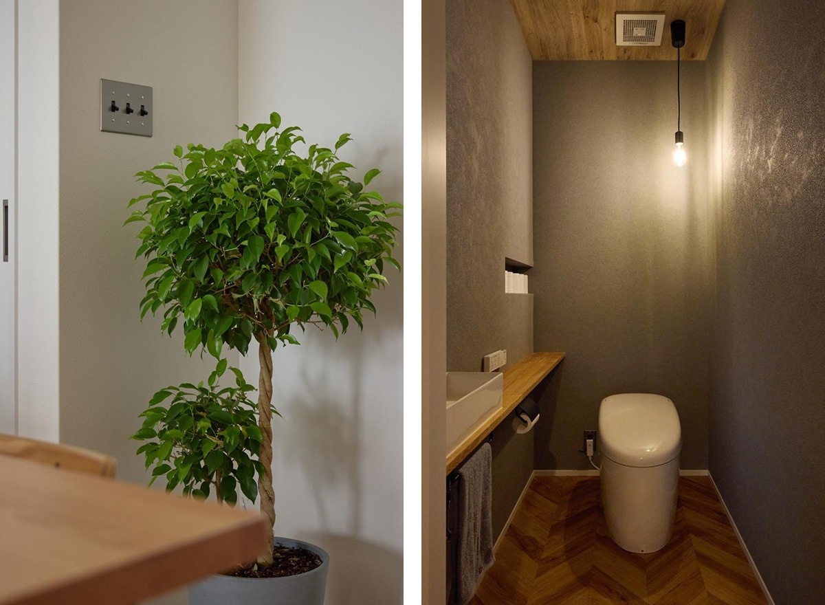 写真左/室内のあちこちを彩るグリーン。照明のスイッチはインテリアにマッチしたタンブラスイッチを選びました。