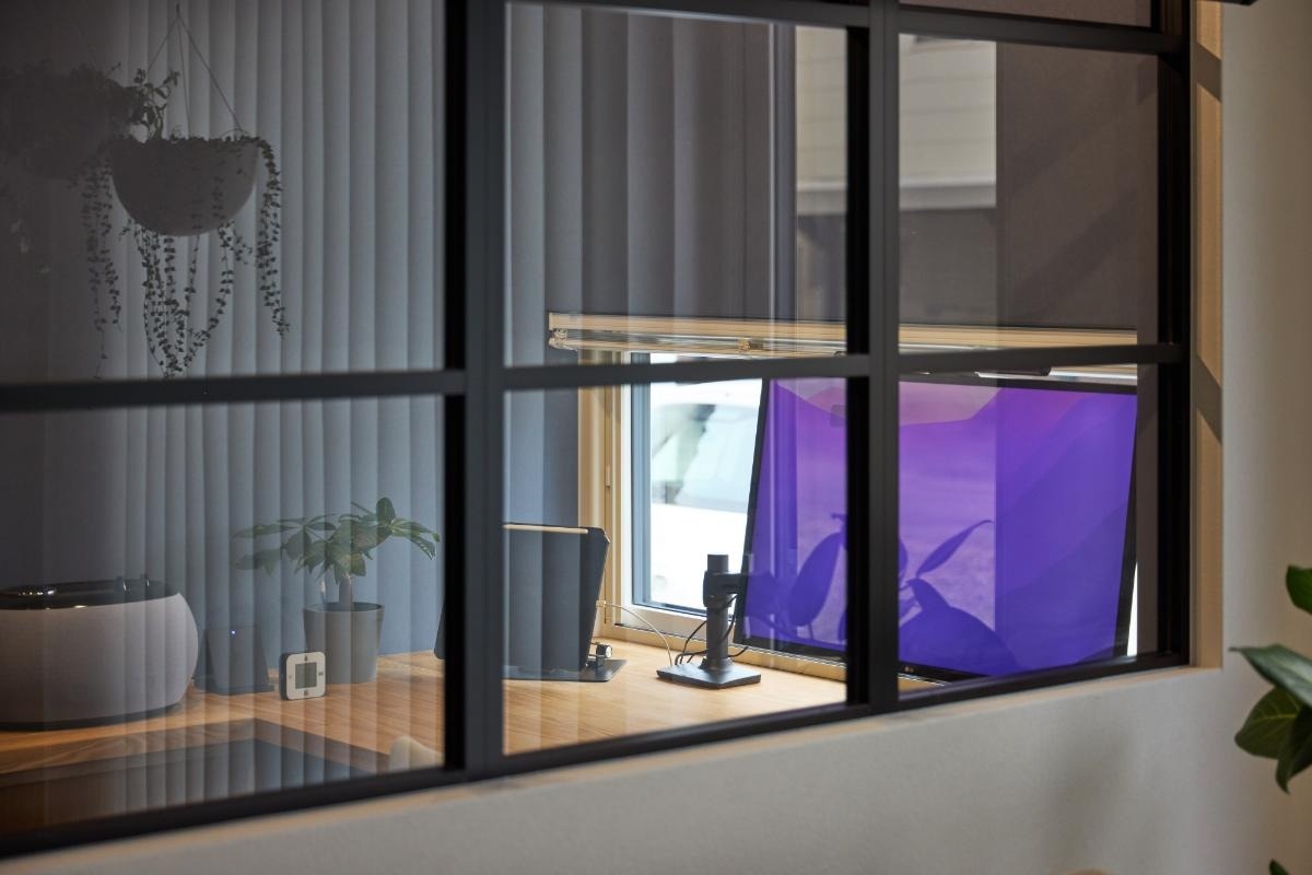 落ち着きのあるブルーグレーのクロスで仕上げた室内。こぢんまりとして無駄なもののない「集中のためのスペース」でありながら、内窓によって閉塞感を感じさせない空間になっています。
