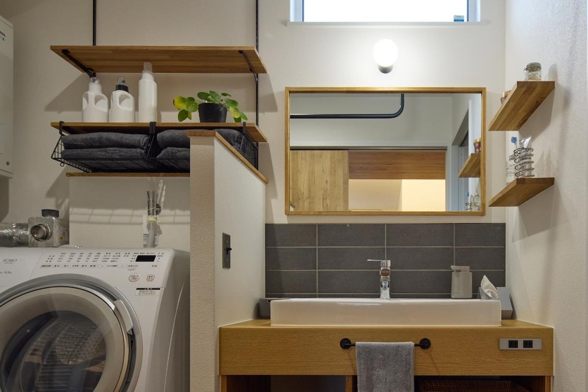 洗面・脱衣室は造作の洗面台と棚でシンプルに仕上げられています。左側のタオル収納は可動棚に市販のハンギングバスケットを組み合わせたものです。