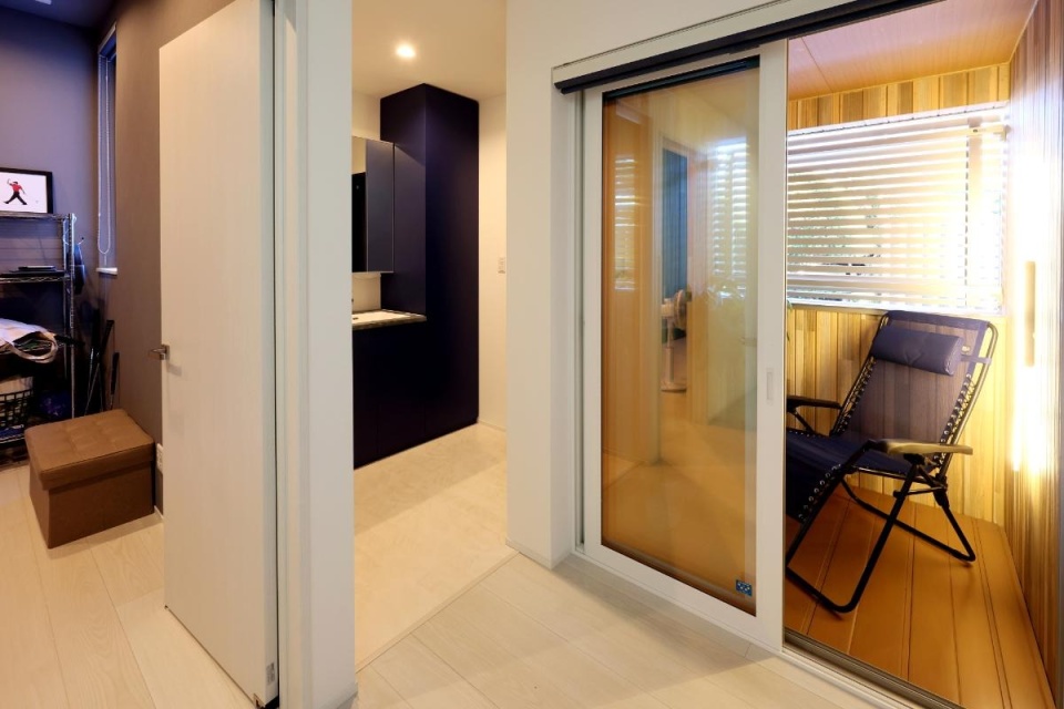 120℃まで上がり、ロウリュも楽しめるホームサウナのすぐ近くに外気浴スペース(写真右)があります。