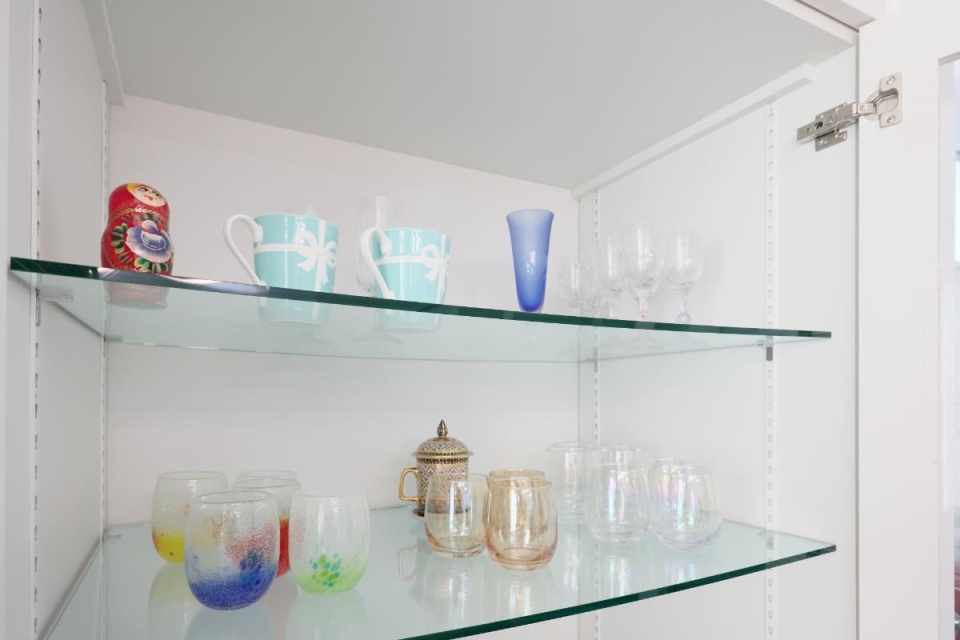 ガラス扉を取り付けた見せる収納には、結婚記念のプレゼントや旅先で買ったグラスなど、思い出の品を飾っているそうです。
