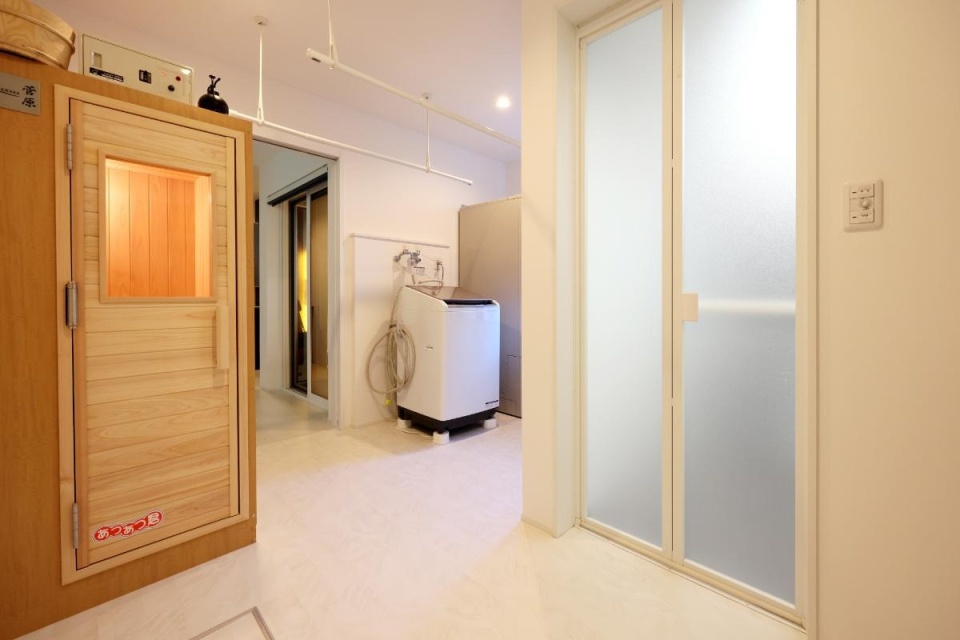 玄関ホールの右手からつながるユーティリティーは、バスルーム(写真右)と洗濯・物干しスペース(写真中央)に加え、ご主人が大好きなサウナ室(写真左)が置かれています。