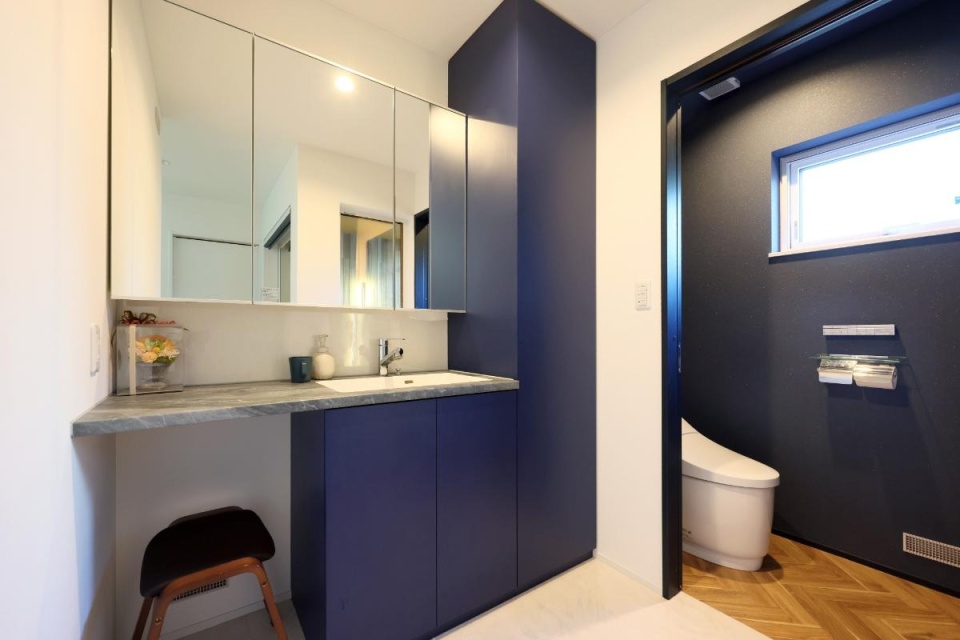 棚を造作した洗面室とトイレは、ネイビーをアクセントカラーにしています。細かいラメがキラキラ光るトイレの壁紙もすてきです。