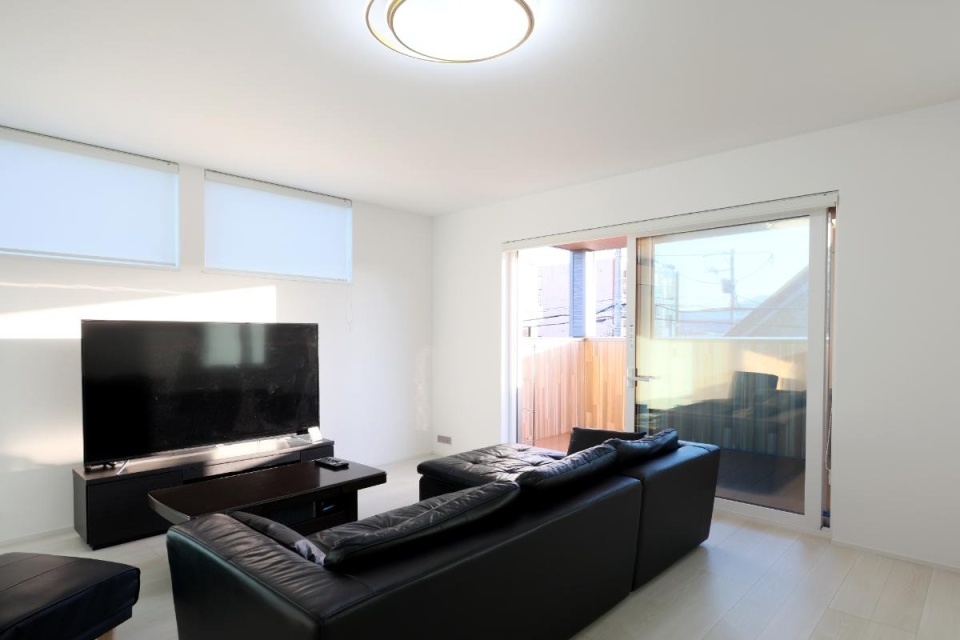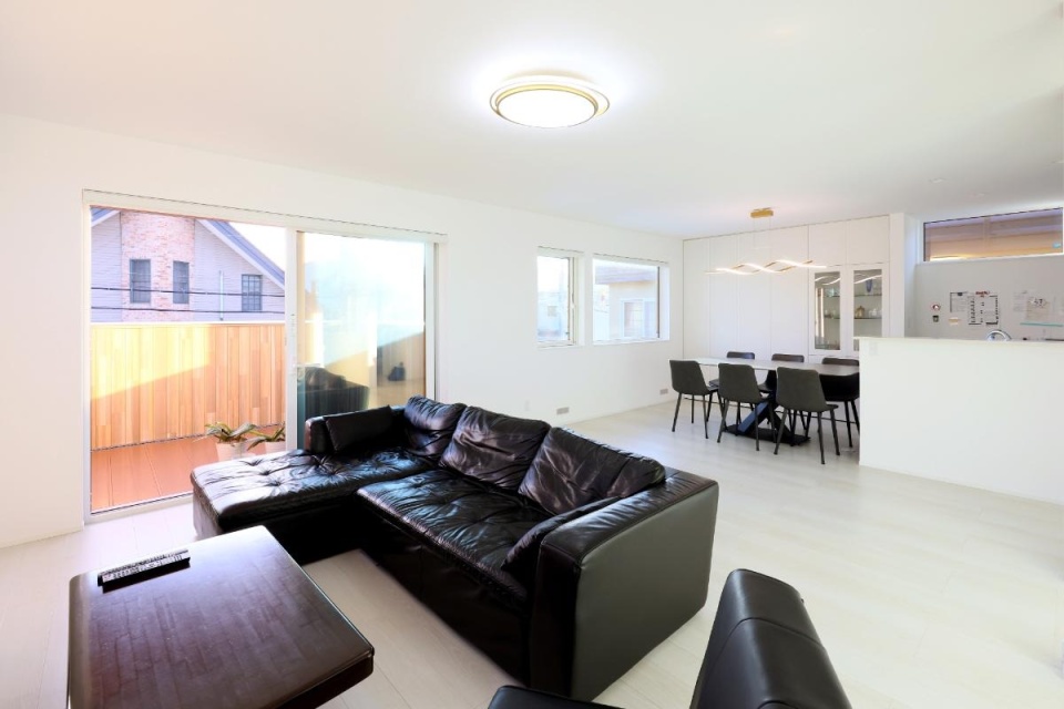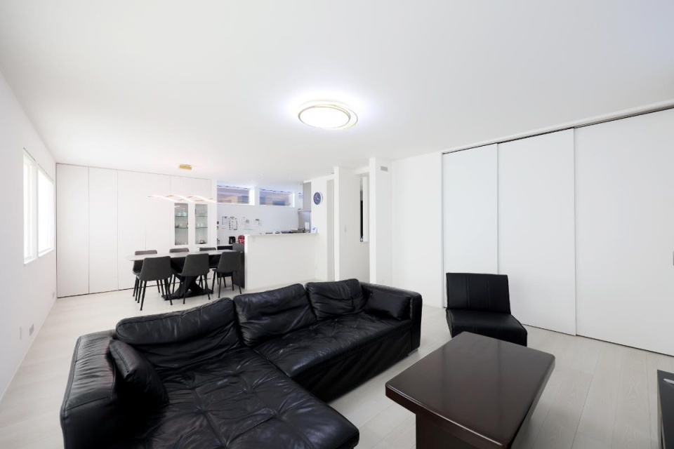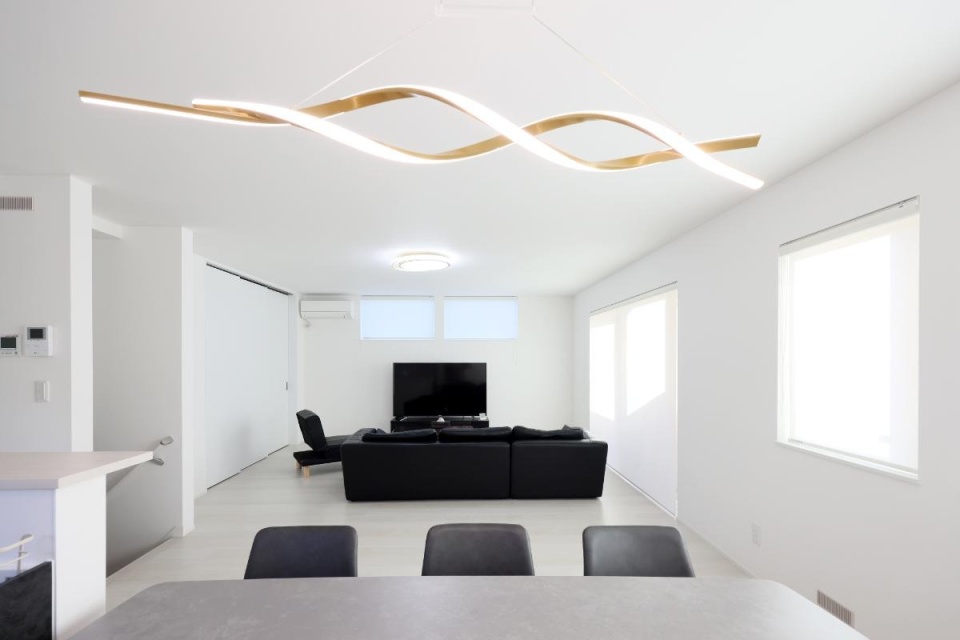 2階のLDKは、40㎡以上の広々とした空間です。白を基調に、家具はモノトーンでスッキリとまとめました。