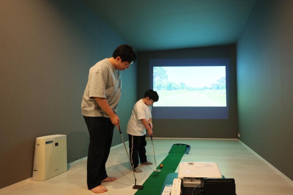 ご主人の趣味であるゴルフ練習用のゴルフシミュレーター室は、天井を40cm高くしています。2階の子ども部屋スペースに細かな段差をつけながらも、使い勝手に違和感のない丁寧な造りが施されていました。息子さんも一緒にパターの練習中です。