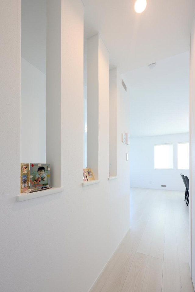ダイニング・キッチンを抜け、階段横の廊下の先に洗面、トイレ、子ども部屋を2室備えています。階段横の壁は、明かり取りも兼ねた開口をつくりました。
