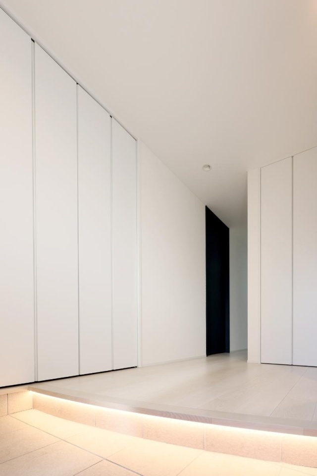 ホワイトで統一されたスタイリッシュで上品な玄関。左手と正面にある収納スペースや寝室(写真中央)の扉を、すべてハイドアにしています。デザインはすっきり、収納力も抜群です。