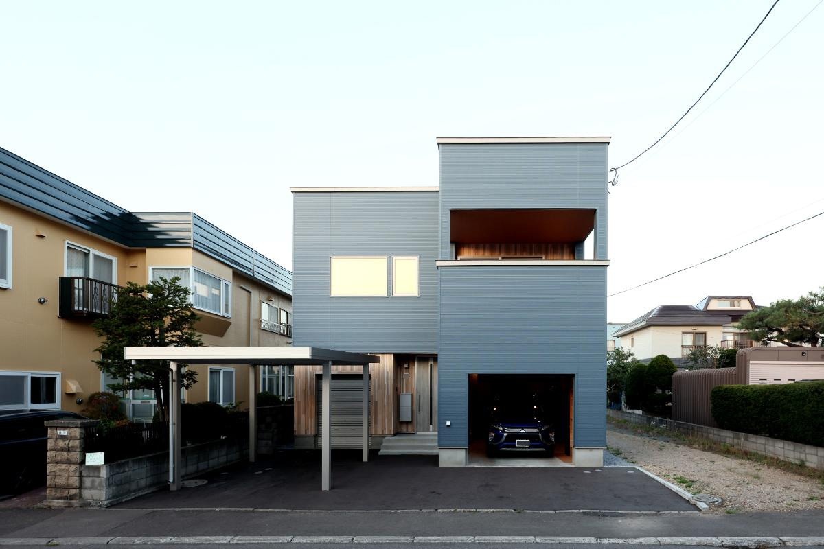 外壁は金属サイディングの横張りを主に、ご主人のお気に入りカラーでもあるネイビーを採用しました。