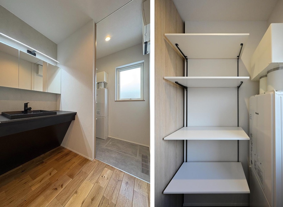 水回りはホールを介して一直線に配置。こちらはリビングの裏手にある洗面室とボイラー室を兼ねたパントリー。洗面ボウルも天板もブラックで統一した洗面化粧台が新鮮。足元の配管は板を斜めに張ってカバーしています。