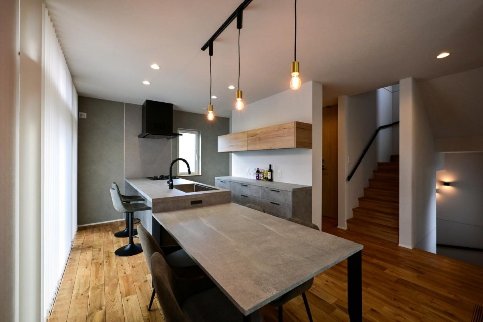 階段を上がると、右手にダイニングキッチン、左手にリビングが広がっています。大きなデザイン窓を配した明るい空間です。