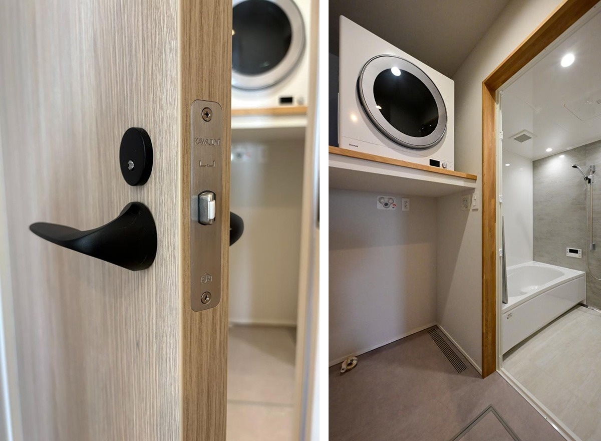 ホールを介した脱衣・洗濯室と浴室。人気のガス式衣類乾燥機「乾太くん」も完備。カワジュンのアイアン調のドアノブもポイントになっています。