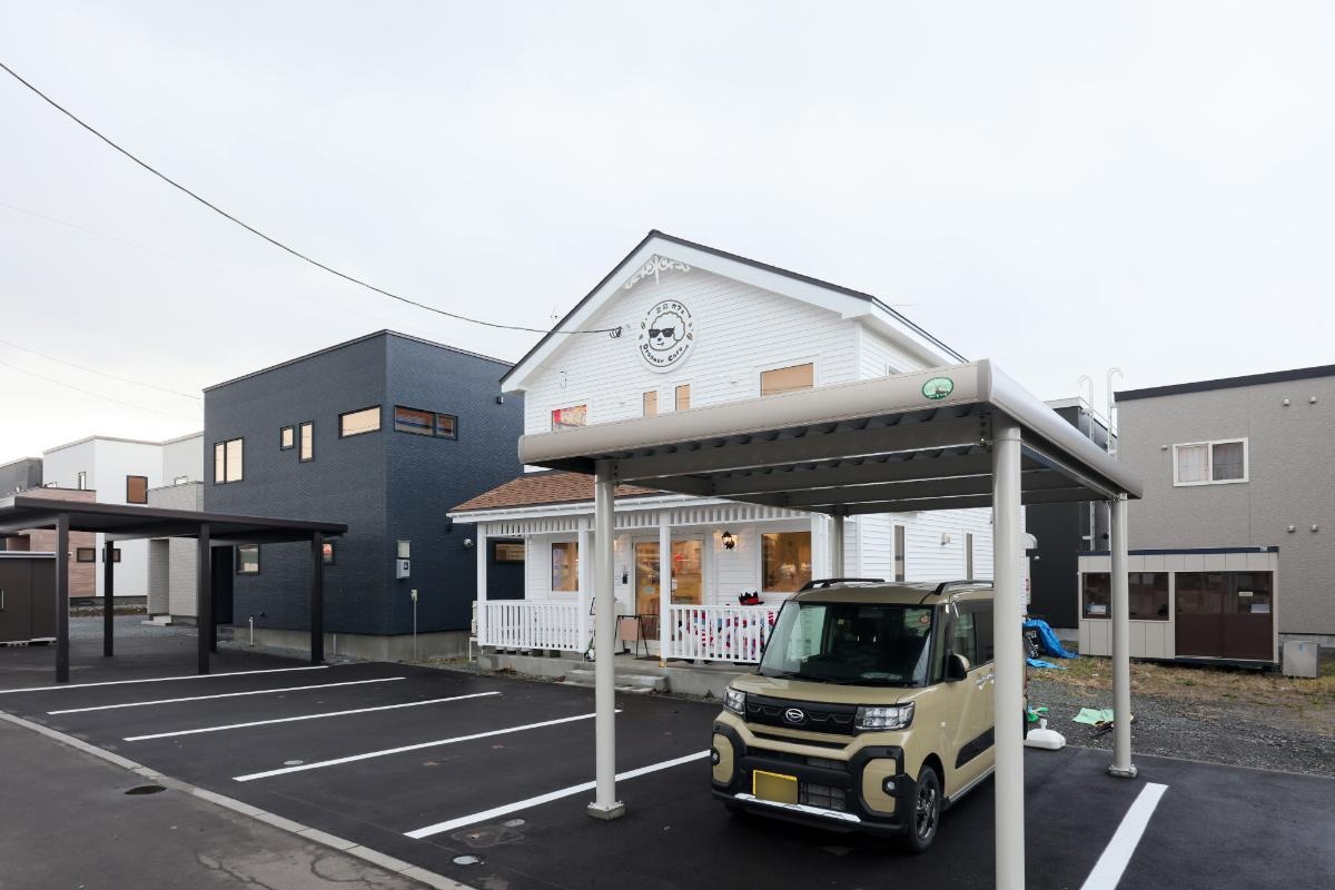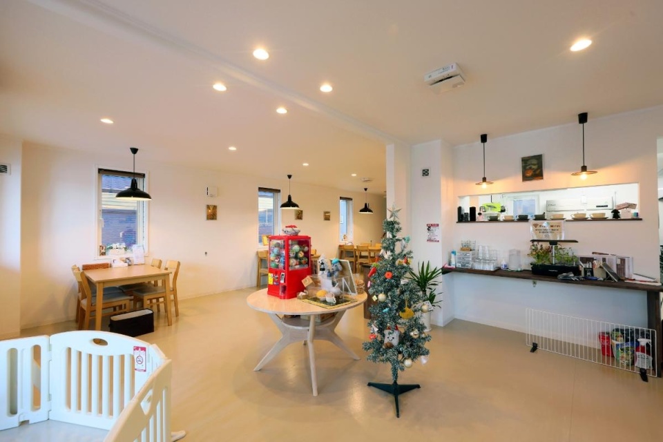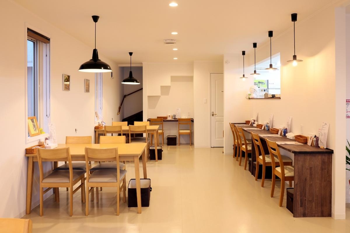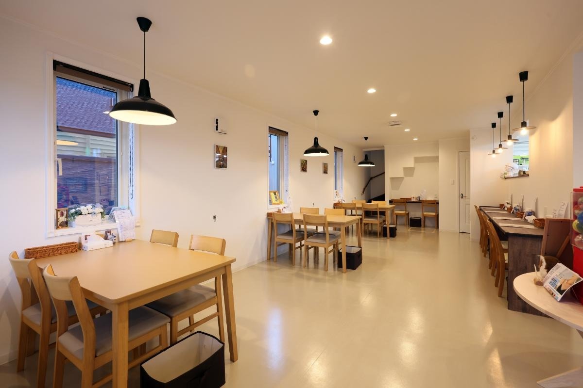 豊岡モデルハウスで気に入ったテイストを生かしながら、外観はカフェにぴったりなデザインに。店内は、ワンちゃんや猫ちゃんでも安全に過ごせるよう、床は掃除がしやすく滑りにくいビニル床シートを使っています。