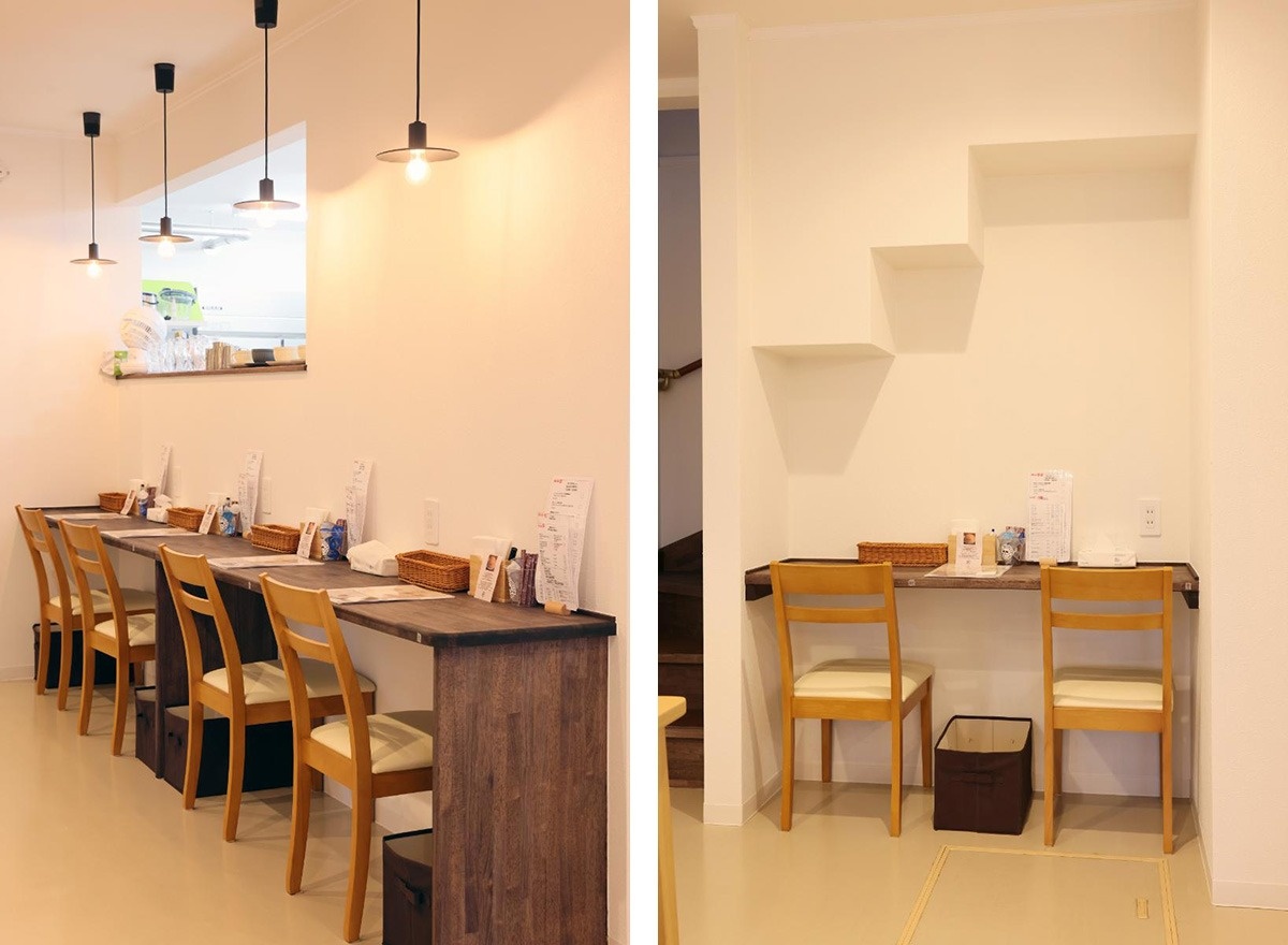 厨房からフロア全体が見渡せる造りで、テーブル席の感覚もゆったりとした配置です。