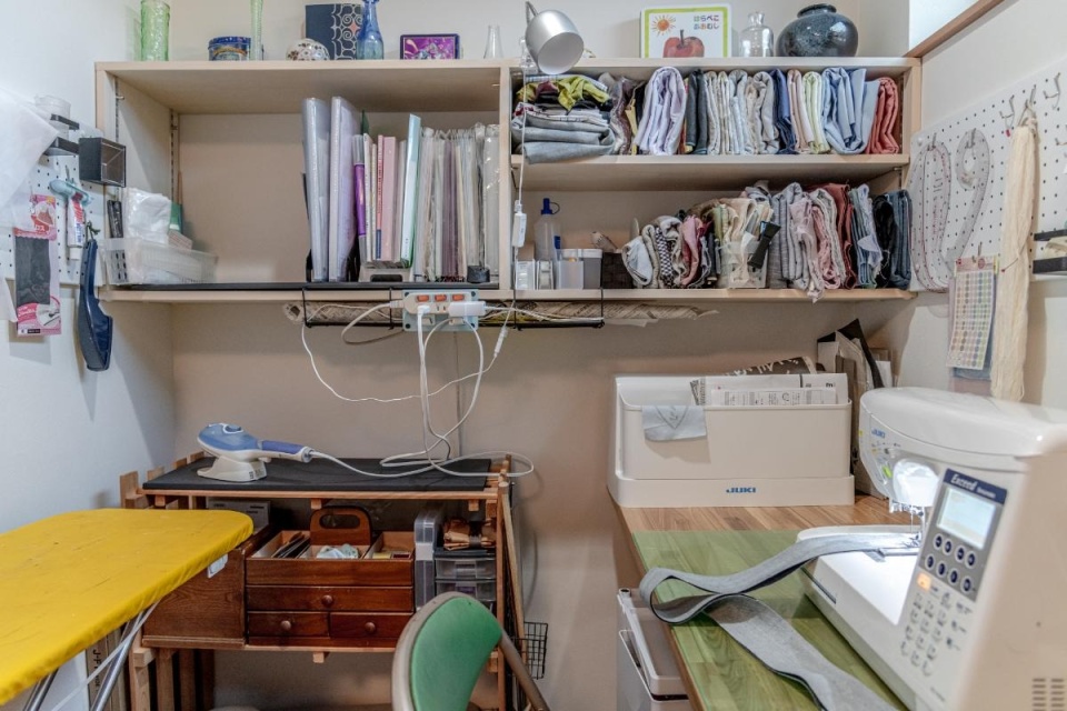 洋裁が趣味で、プロとして通用しそうなほどの腕前を持つ妹さんの部屋は、ミシンを置くカウンターと棚を造作したソーイングスペースを併設しています。