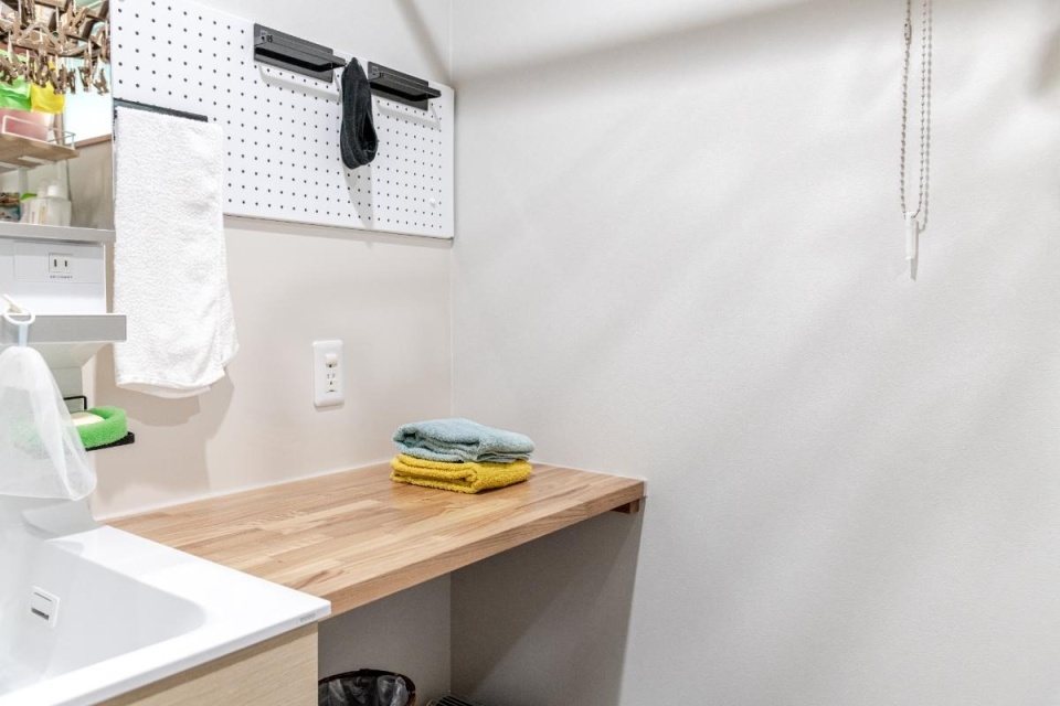洗面スペース兼ランドリーには、アイロンかけや洗濯物を畳む時に便利なカウンターを造作しました。