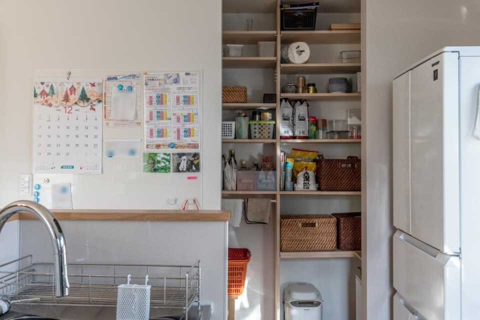 キッチンの右側には可動棚を設置したパントリーがあります。