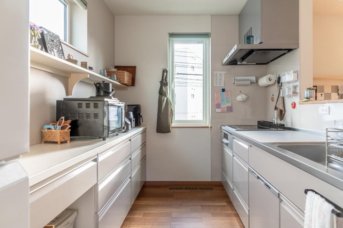 東と南の2方向に窓がある明るいキッチン。通路が広いため作業しやすく、カップボードの引き出しをうっかり閉め忘れても、ぶつかってケガをする心配がありません。