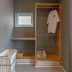 写真左/洗面スペース兼ランドリーとLDKを結ぶ通路上には、片付けしやすいオープンなファミリークロークを配置。