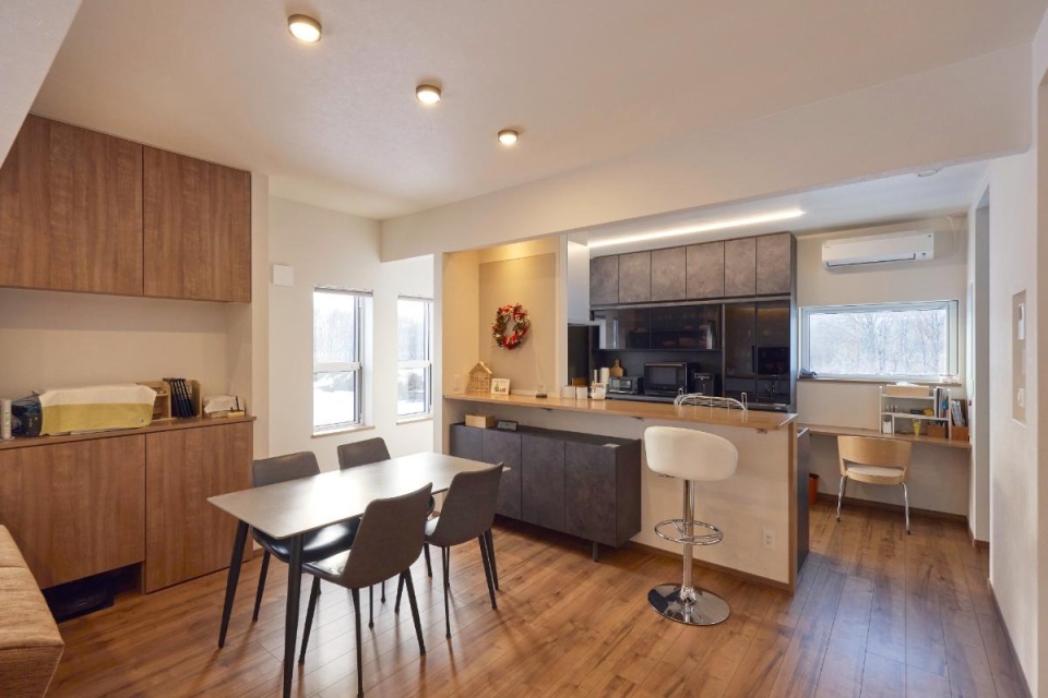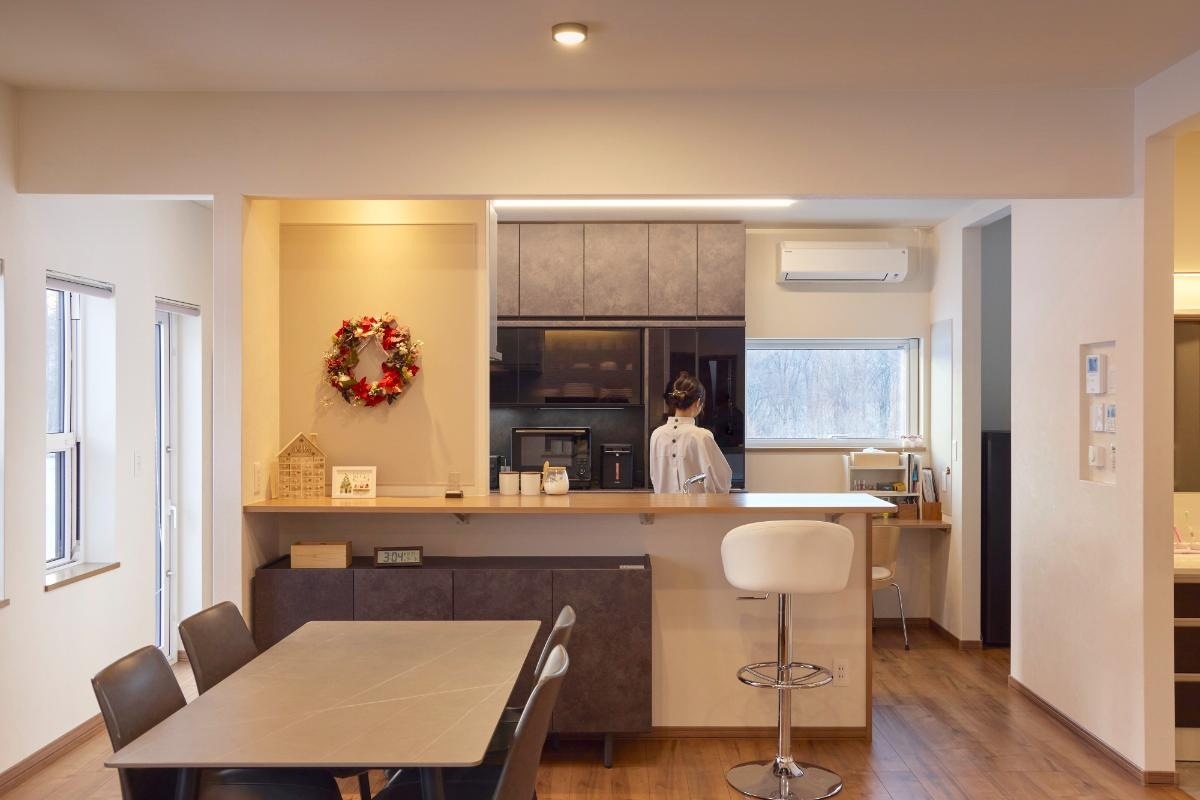 農繁期は農作業のお手伝いをする方を迎えることも多いというHさん。キッチンとダイニングの間にはほどよい距離を設け、高さのあるカウンターで手元が隠れるスタイルを採用しました。