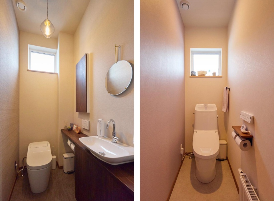 1階トイレ(写真左)にはニッチ型の収納や手洗いが。インターネットで購入したという鏡もおしゃれです。2階トイレ(写真右)にはラベンダー色のアクセントクロスを採用し、やわらかい雰囲気に仕上げました。
