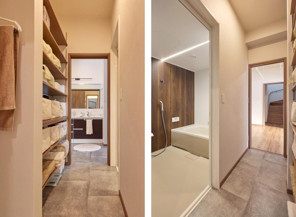 写真左/洗面所への通路には、収納に加えて家族のバスタオルを干せるスペース(写真手前)も作りました。