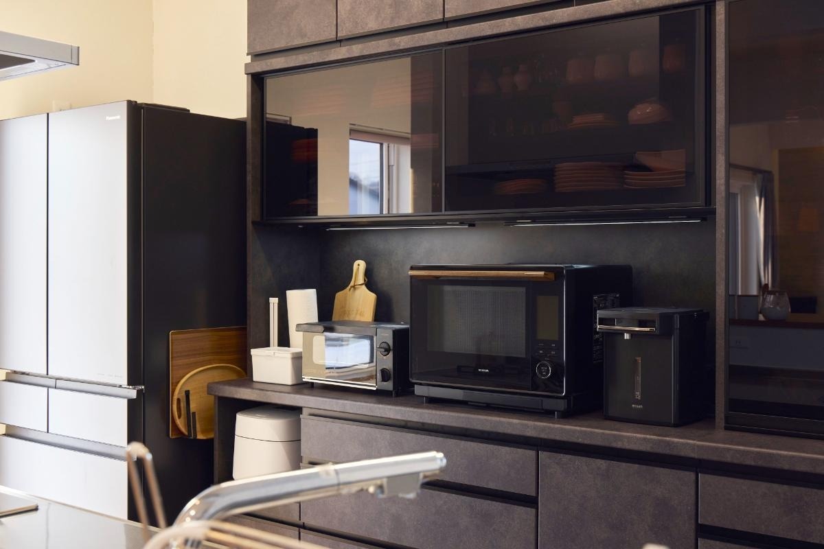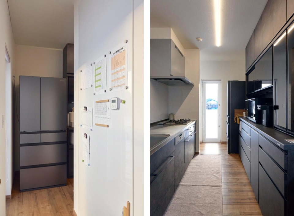 写真左/キッチンの隣にはオープンタイプの大きなパントリーがあります。部活のかさばる水筒などをサッと持ち出せる動線の良さも便利。中央のドアは保冷庫です。
