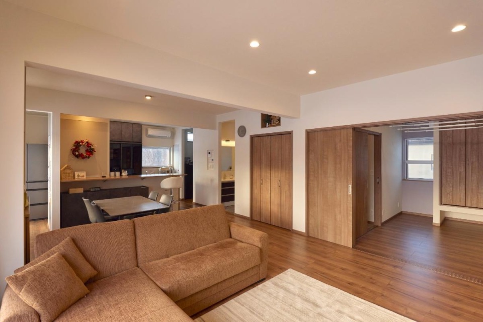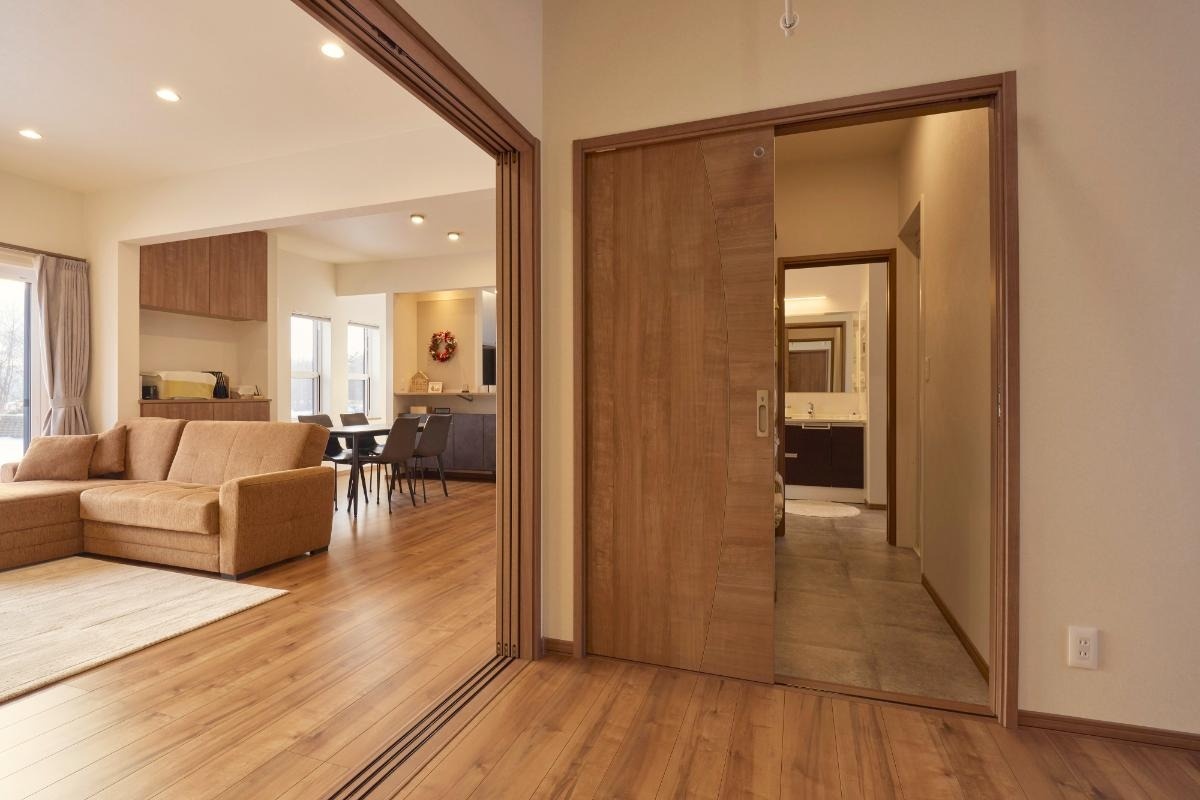 この部屋から浴室・洗面所までは一直線の間取り。リビングにお客さんがいても、この洋室の引き戸を閉めることで「ゲストを迎えるエリア」と「ファミリーエリア」とを分けられる造りです。