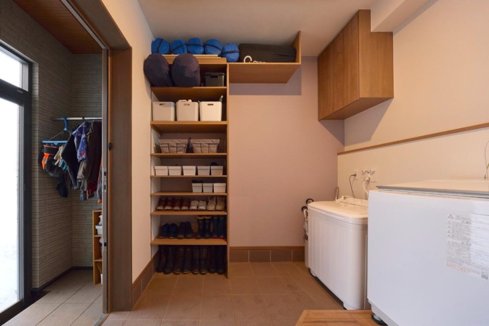 農家住宅で重要とされるのが裏玄関です。出発前や帰宅後の着替えがスムーズにできるよう、洗濯機を置いたうえで十分な面積を確保しました。風除室(写真左側)にもラックを設置し、汚れのひどいものは家に入る前に脱ぐことで、室内に砂を持ち込まず、清潔に保てるようになっています。