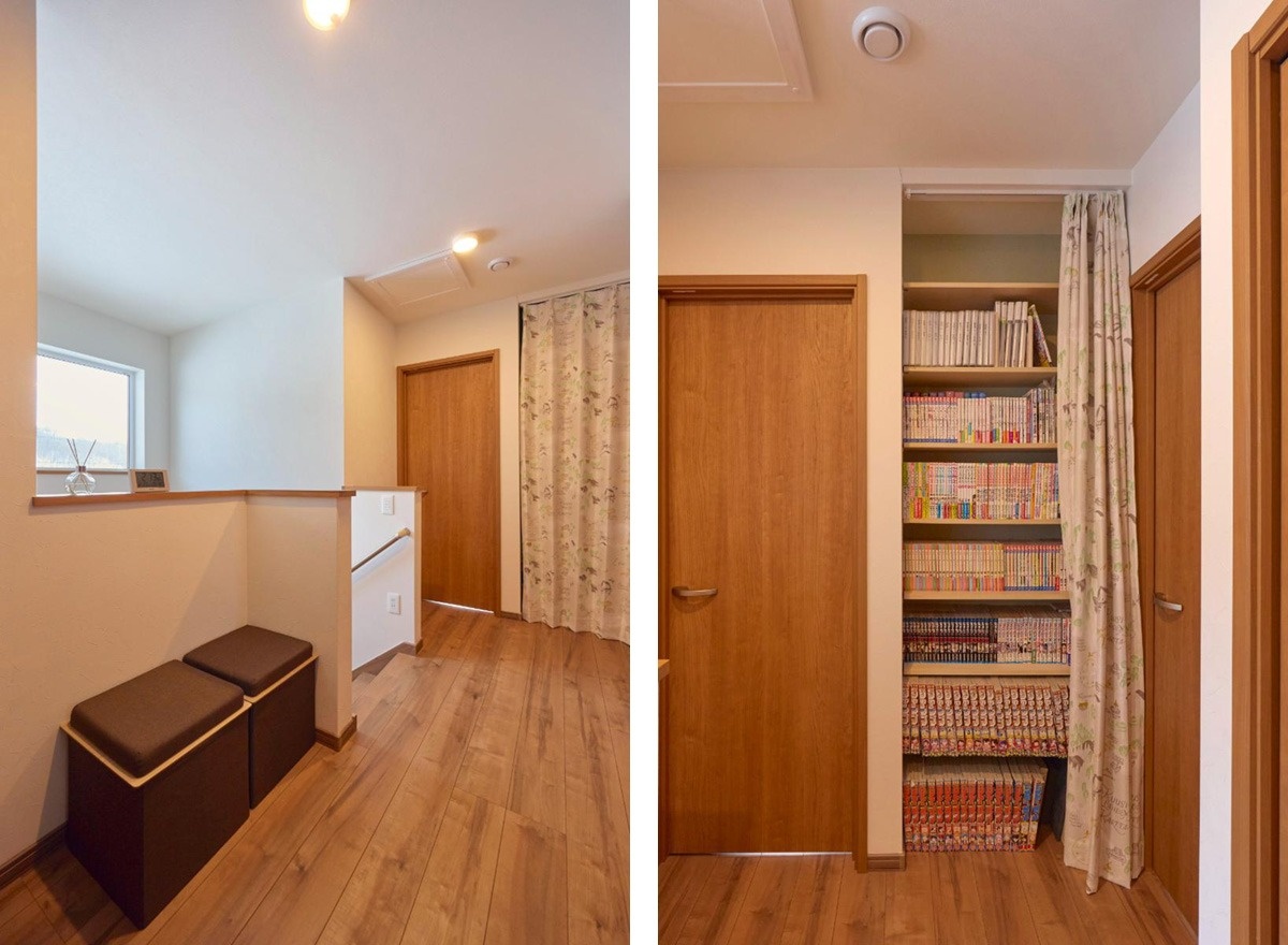 2階は寝室と個室です。ホールには内側が収納になる椅子と造作の本棚がありました。