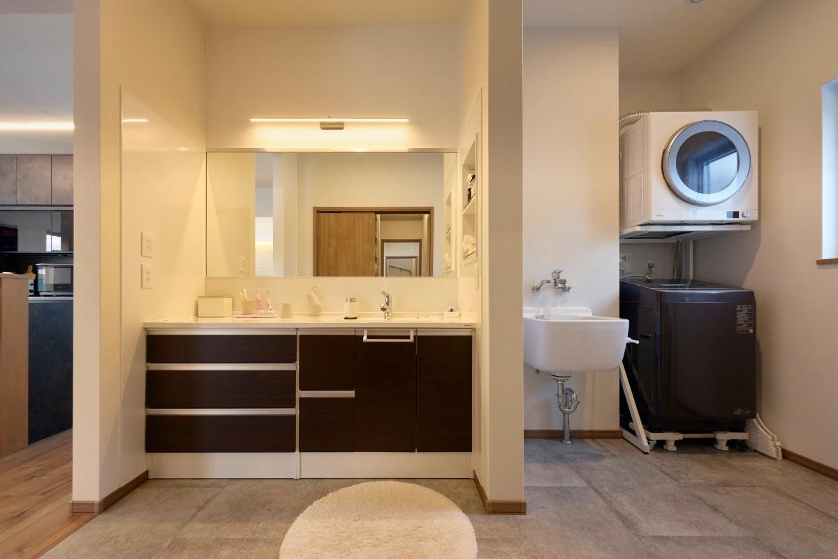 「家族で過ごす1階を広く、気持ちよく過ごせる空間にしたかった」と奥さま。洗面室には大きな鏡を取り付け、家族の使用時間が重なってもゆったりと過ごせる広さになっています。