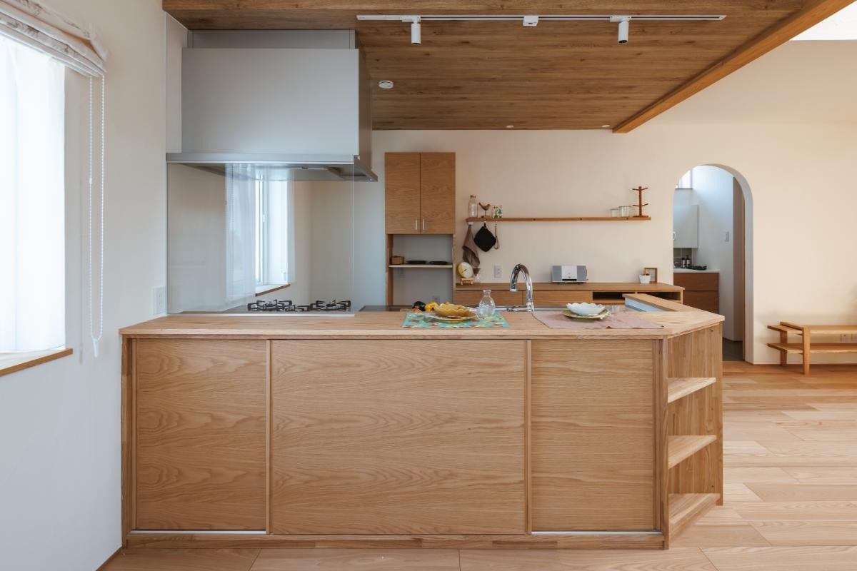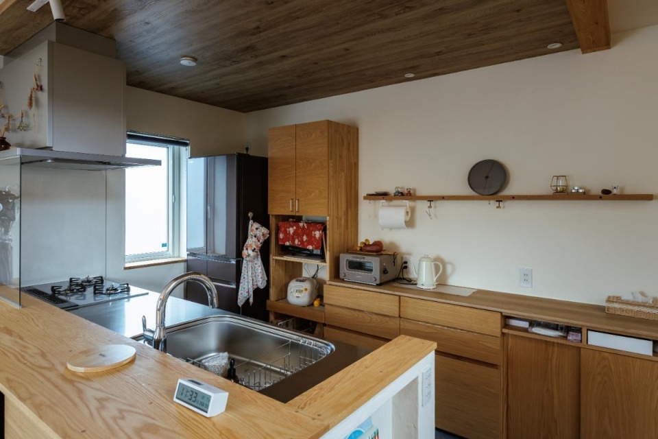 キッチンの側面(写真手前)は、引き戸式の造作棚になっています。使い勝手に合わせて高品質な造作家具でコーディネートできるのもキクザワの魅力です。